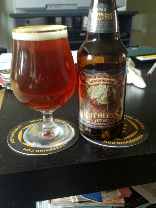 It has a nice dark ruby-red color with a nice off white to tan color head. The smell has a heavy malty to caramel notes with hints of earth to piney. The taste has a malty to earthy hop notes with a dry bitter hop aftertaste. It is pretty drinkable beer.